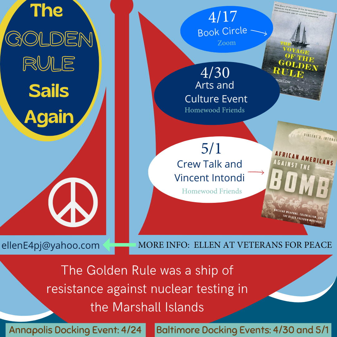 The skipper of the original Golden Rule, Albert Bigelow, wrote a book entitled The Voyage of the Golden Rule: An Experiment with Truth. The Peace and Social Justice Committee (PSJ) of Homewood Friends encourages everyone to read this book. (See below for book purchase options).