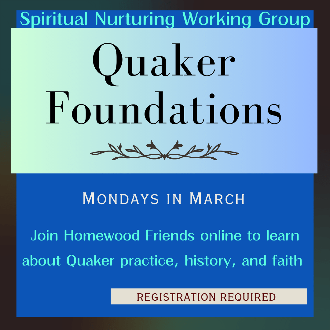 Friends, the Quaker Foundations course, scheduled for 5 Monday evenings in March, is an excellent way to get a comprehensive overview of the fundamentals of our rich Quaker tradition. Newcomers and oldtimers alike are encouraged to participate in this on-line offering using a combination of lecture, small and large group discussion and videos. Please consider joining us!!
