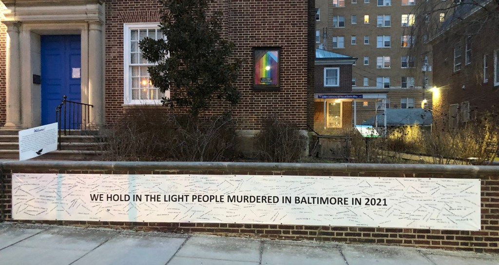 In June of 2020, a banner was installed on the wall in front of the meetinghouse as an outgrowth of that concern. The banner remembered the names of persons murdered in Baltimore during 2020. We hang a new banner each year, as of 2024.