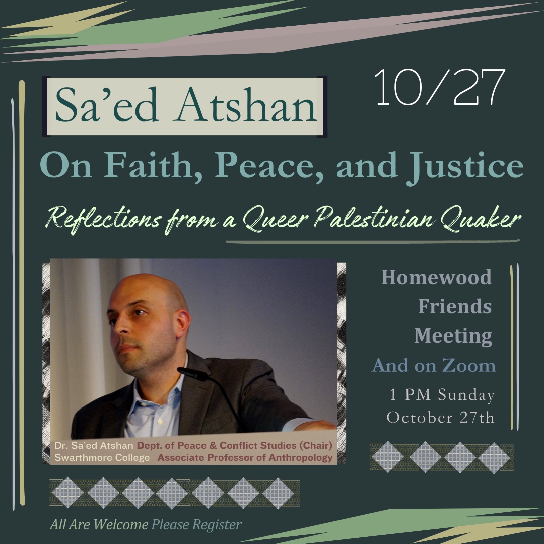 1 PM on Sunday 10/27: Professor Sa’ed Atshan, chair of the department of Peace and Conflict Studies at Swarthmore College, will visit Homeowod Friends Meeting to talk about peacebuilding today, after a year of horrific crisis in Gaza that continues to escalate and expand. Sa’ed will draw on his Palestinian, queer, and Quaker identities to highlight pathways to justice and liberation that maintain key intersectional protections in the struggle (notably, how Palestinian national survival and resistance can work in conjunction with Palestinian LGBTQ survival and protections)